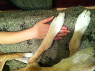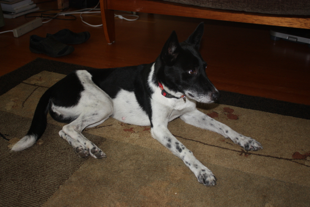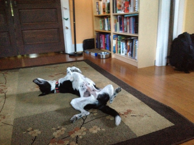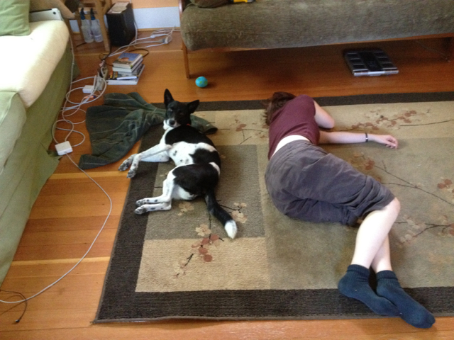 For Luna, this process began in earnest a day and half later, on Wednesday night at about 9pm. At this point she could no longer walk, so when her breathing became very rapid, we carried her upstairs to a spot she had chosen several days before. Brad and I and Astro were with her through the night. At about 2:30am I began to whisper the Gayatri mantra to her. This is the mantra I end all of my meditation sessions with, so she was familiar with it from our many sessions together. It is also the mantra I would chant to her in the car on our way back from each vet appointment to let her know we were going home. The Gayatri is the mantra of light and it seemed to calm her down and slow her breathing. At 5am, Luna stopped breathing and was still. She never suffered. She passed with a whispered sigh.