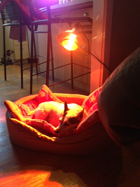 - For arthritis therapy – use the same technique but work over joints and along the spine. Do not use heat therapy along the thoracic spine because there is a danger of using too much heat over the liver, which does not like to be hot. Do not worry about this if you are letting an animal “self medicate” and the bulb is up higher. I especially like the “self medicate” option for older cats who just love the heat.